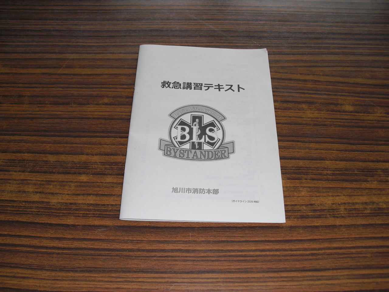 7月7日(日)に旭川市消防本部の主催で開催された普通救命講習を受けてきました。最初の1時間は、テキストとDVDで倒れている要救助者を発見してから救急車が到着するまでの応急処置の手順や、心臓マッサージ(胸骨圧迫)と人口呼吸の仕方、AED(自動体外式除細動器)の使い方などの勉強をしました。
