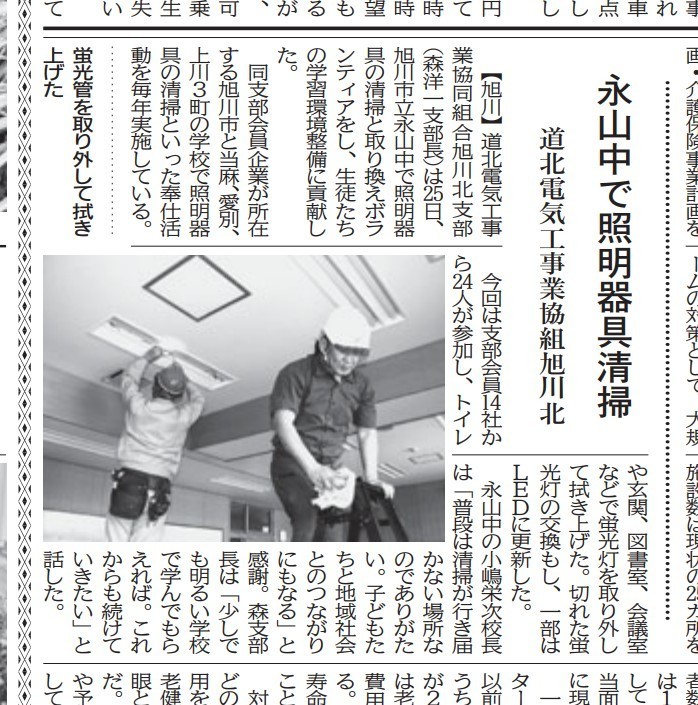 弊社が加盟している道北電気工事業協同組合では毎年、地域貢献の一環として奉仕活動を実施しています。今年は、永山中学校で照明器具清掃の奉仕活動に弊社から4人参加してきました。