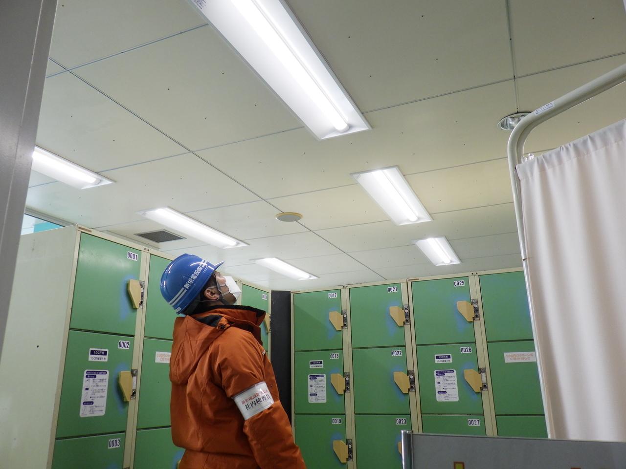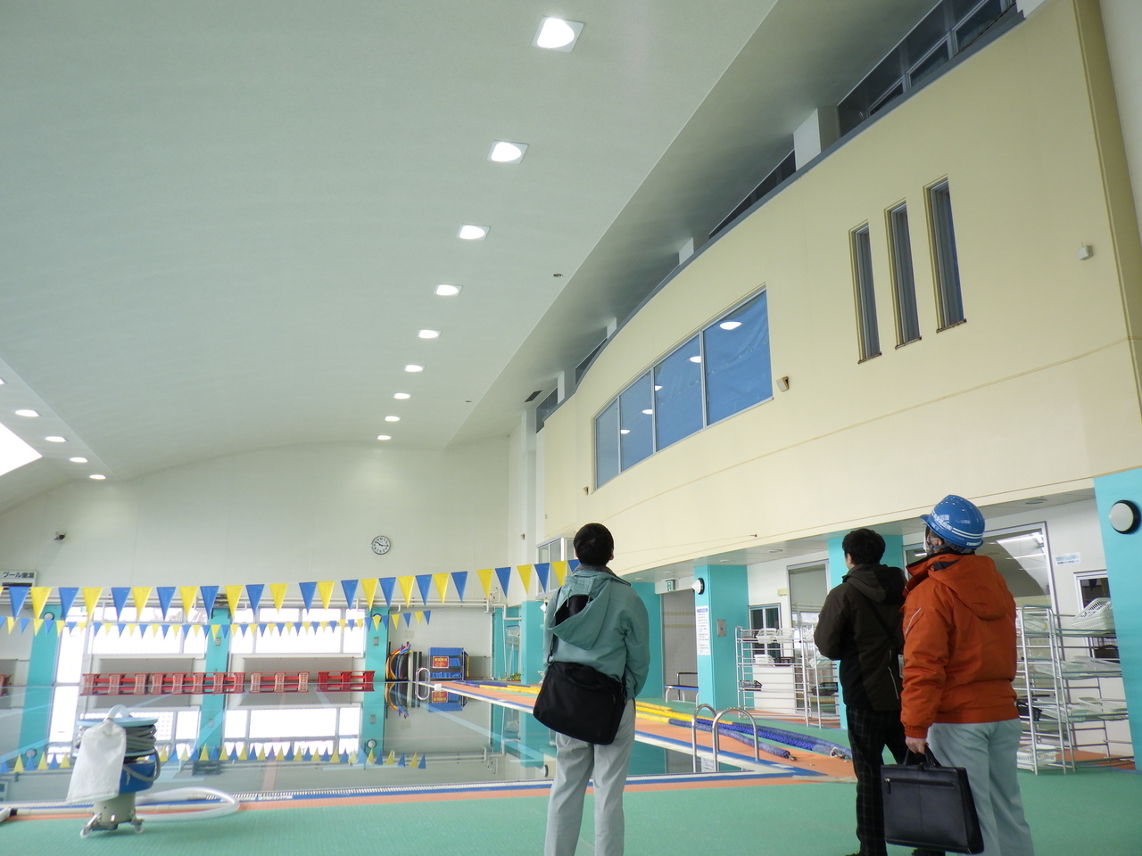 検査箇所は、温水プール・男女更衣室・趣味室・娯楽室等、各部屋のLED照明の取付けや点灯状況を確認しました。まだ、2/3くらいの仕事が残っていますので、引き続き安全第一で作業にあたってほしいと思います。